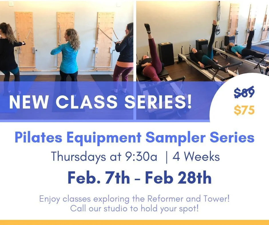 Join Courtney for a 4 week class that will explore the Reformer and Tower, allowing you to try new equipment and work with the same small group to build on what you're learning each week! This class is perfect for all levels and has only 4 spots available, so register hold your spot!